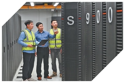 在位于廊坊的河北人工智能计算中心机房内,负责人赵紫铜(中)和运维人员一起巡检机房。刘 向摄(人民视觉)