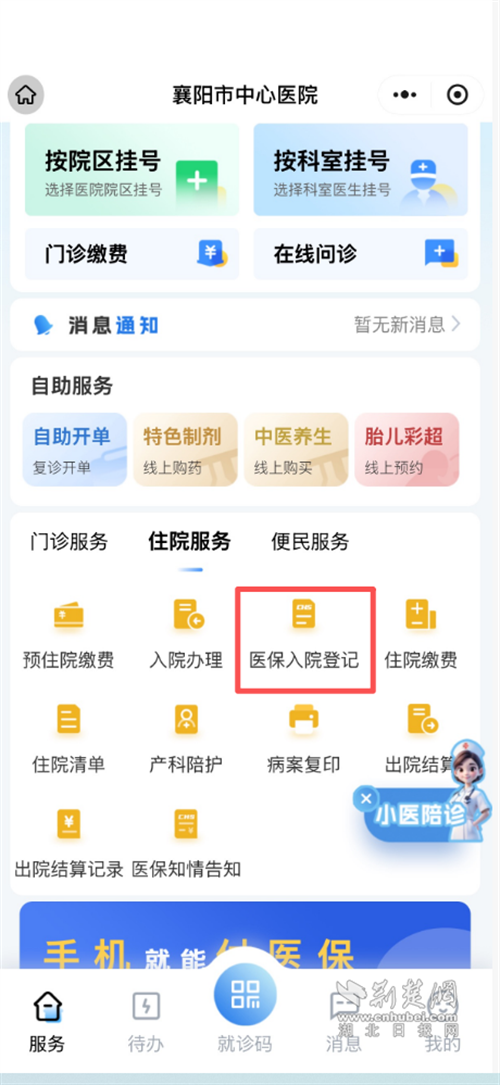 第一步:打开「襄阳市中心医院」官方小程序,在“住院服务”中点击“医保入院登记”