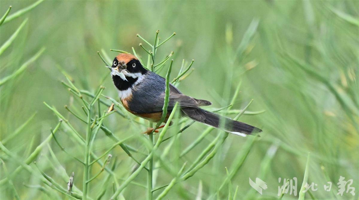 长江宜昌段防护林中,红头长尾山雀在枝叶间敏捷穿梭,尖喙衔住昆虫,忙着捕食护林。