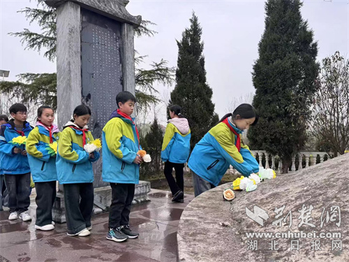 在樊城区太平店镇,太平店实验小学组织孩子们前往肖庄农民起义革命烈士纪念馆,那里长眠着英勇牺牲的烈士们,故事在当地口口相传。活动现场,少先队员代表站在纪念碑前,用稚嫩却坚定的声音讲述那段发生在脚下的历史。学校将乡土红色资源转化为生动的思政教材,让孩子们在“家门口”的烈士墓前,真切感受革命先辈的牺牲与奉献。