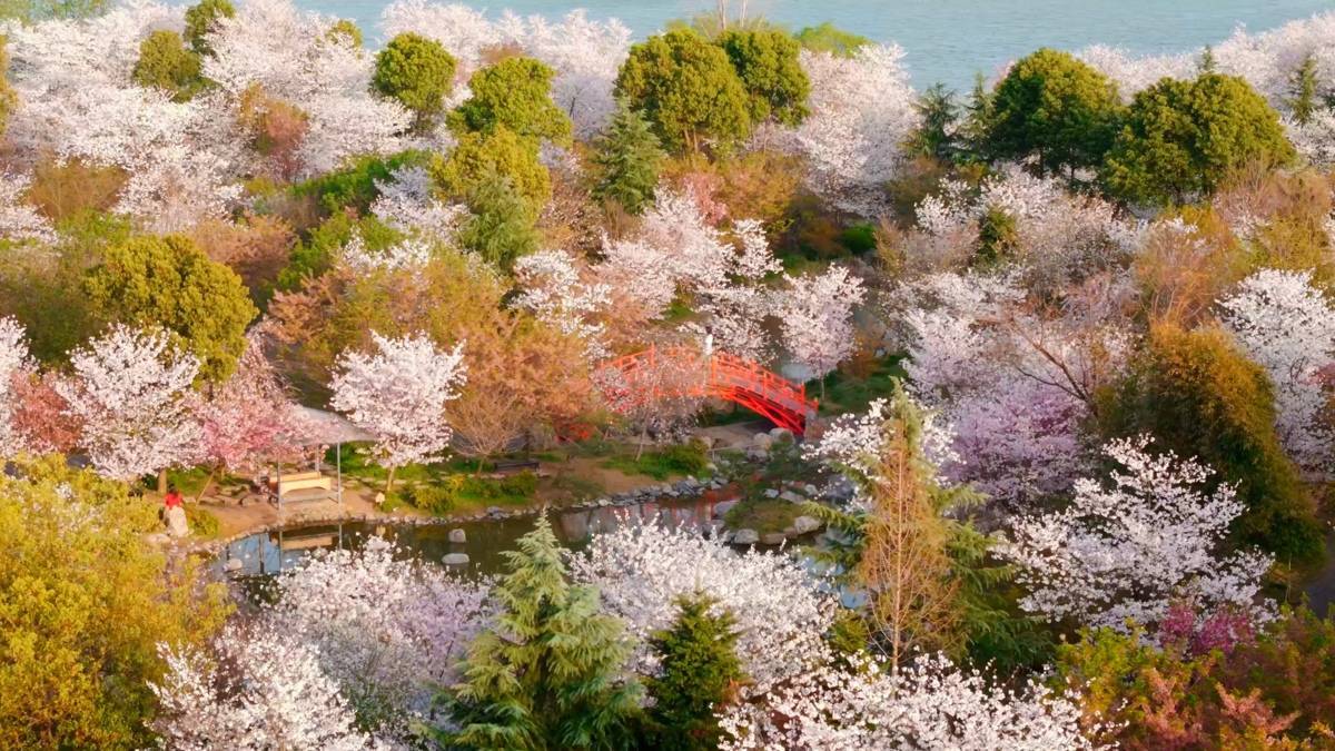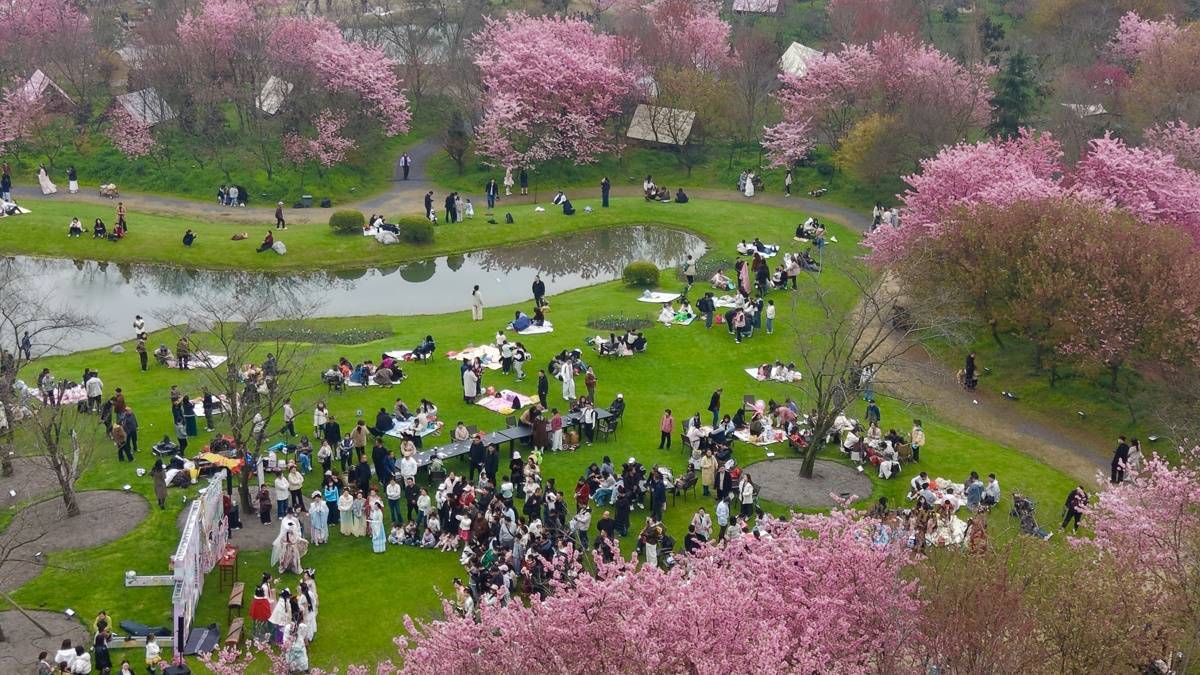 又是一年樱花季,荆州浅山森林美术园数万株樱花竞相绽放,“十二花神”手提花篮穿梭其间,与游客欢乐互动。