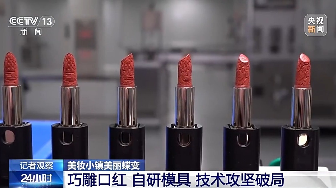 在小镇另一家企业,一支口红的变化,更能体现国货的技术突破。过去,想要生产带有精美浮雕的口红膏体,只能高价进口硅胶模具,每套价格40元,下单后还需等待三四个月,难以跟上市场节奏。企业下定决心自主研发,仅模具配方就试验近500次,耗时两年。如今,企业自主生产的硅胶模具,使用寿命与进口产品相当,成本降至10元以内。外观精美的浮雕口红,承重力也十分出色,悬挂200克砝码也不会断裂。
