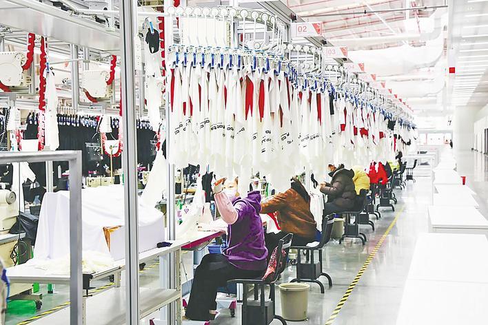 与传统服装车间不同,这座2万平方米的厂房内,各环节操作台上方均安装了智能悬吊系统,被工人们称为“空中走廊”。