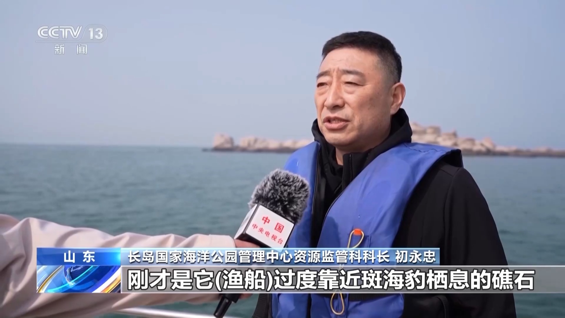 长岛国家海洋公园管理中心资源监管科科长 初永忠:渔船过度靠近斑海豹栖息的礁石,因此我们劝离渔船。我们在礁石周边也投放了许多浮漂式的警示标志。检查、巡护有没有闯入核心区的船只、游客等破坏生态环境及影响斑海豹生活的情况。