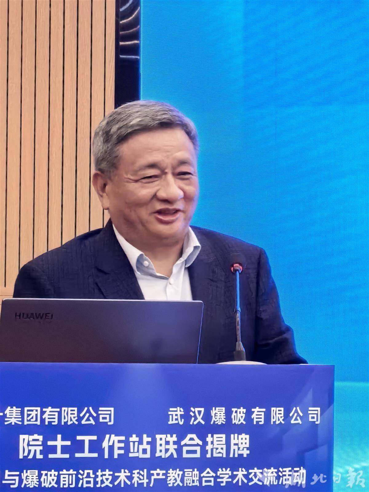 3月31日,江汉大学党委委员、副校长、武汉爆破有限公司董事长贾永胜教授致辞。(湖北日报全媒记者包东喜摄)