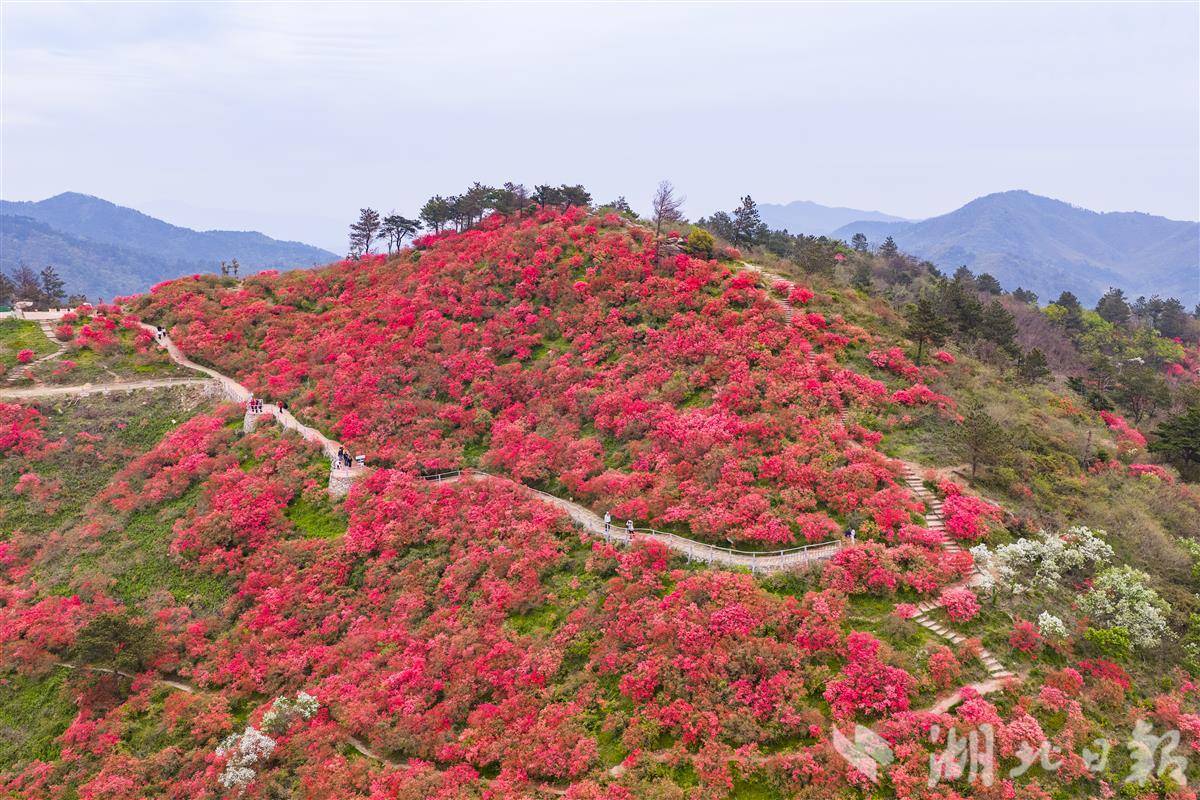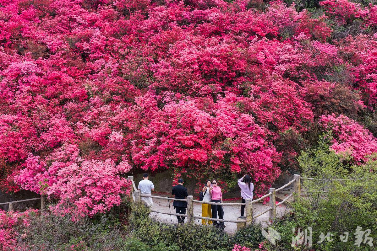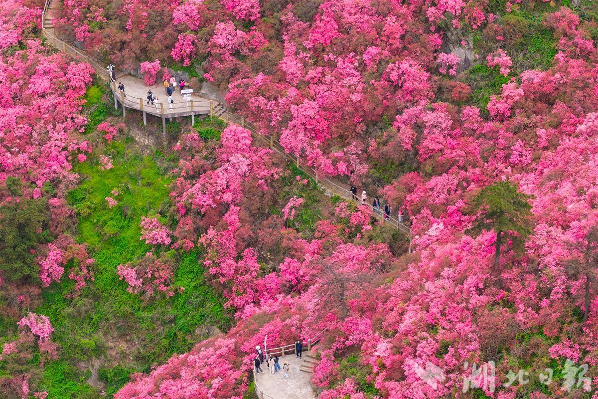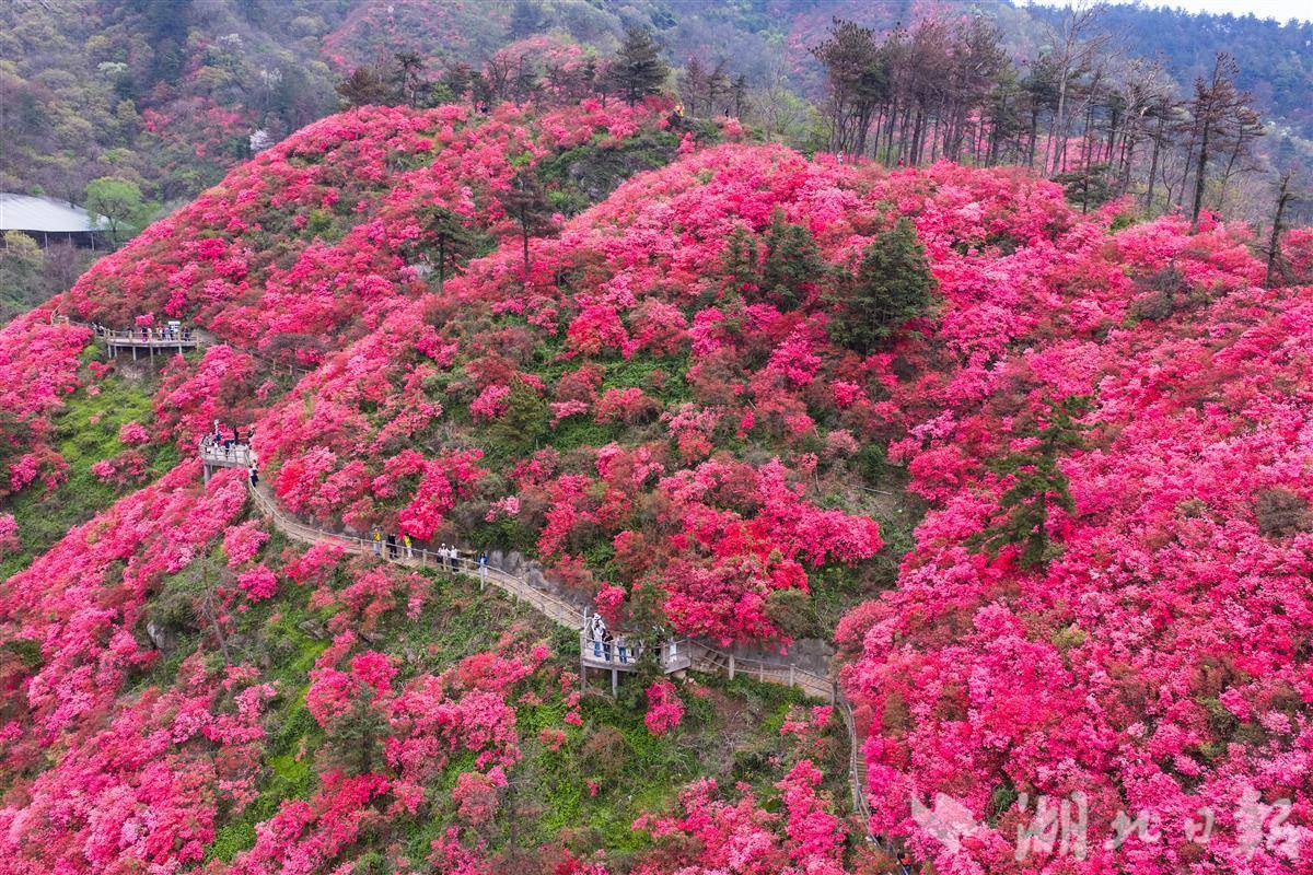 最美人间四月天,2026年4月1日,武汉黄陂云雾山万亩野生杜鹃进入盛花期,花宇山、花海等核心赏花点漫山红遍,蔚为壮观。这里是华中规模最大的野生杜鹃群落,有映山红等7个品种。依托立体气候,杜鹃梯次开放,赏花期长达50天。海拔200米花宇山正值最佳观赏期,400米花海宜取景,700米花洋花期可延续至5月初,方便游客错峰出游。(湖北日报全媒记者 倪娜 通讯员 黄宣 摄)