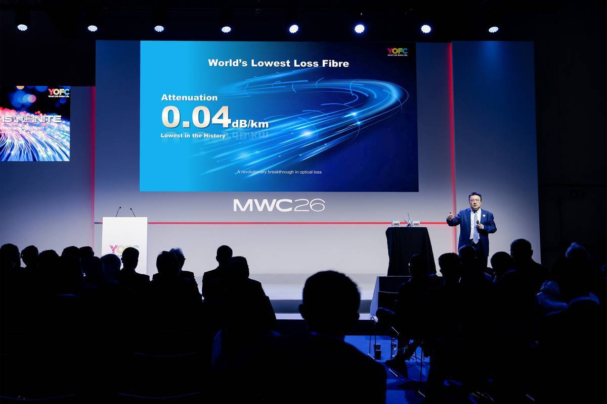 2026年世界移动通信大会(MWC2026)上,长飞光纤发布全球最低衰减0.04dB/km空芯光纤