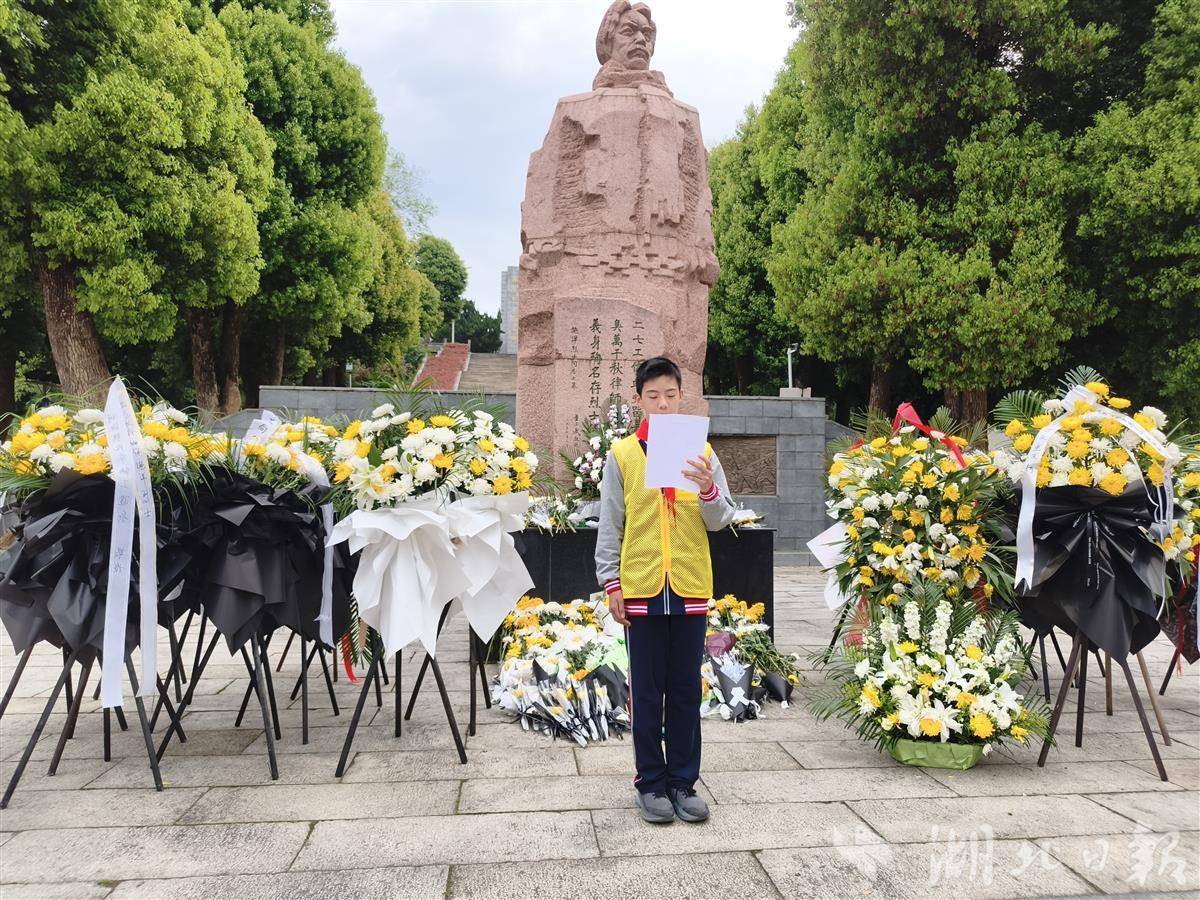 “施洋烈士用生命捍卫了工人的权益,他的精神就像这座纪念碑一样,永远屹立。”在烈士雕像前,武汉市武珞路中学学生杨哲宇作为代表发言,他紧握话筒,声音坚定,表达了对先烈的崇敬。来自付家坡小学的熊思舜同学也用稚嫩但真挚的语言,诉说着对英雄的追思。
