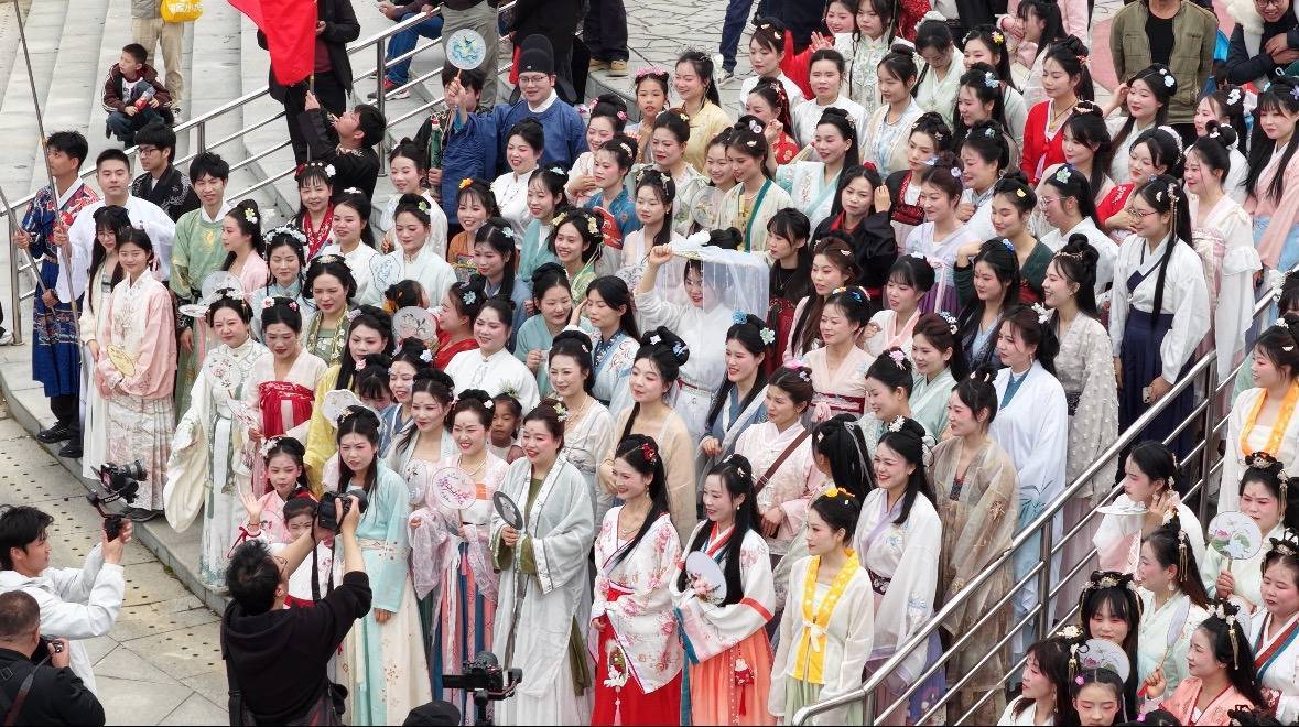 “首次见到这么壮观的汉服巡游。”麻城游客陈先生举起手机,镜头追随着队伍穿过彩虹桥,掠过田野,最终汇入鼎沸人潮。