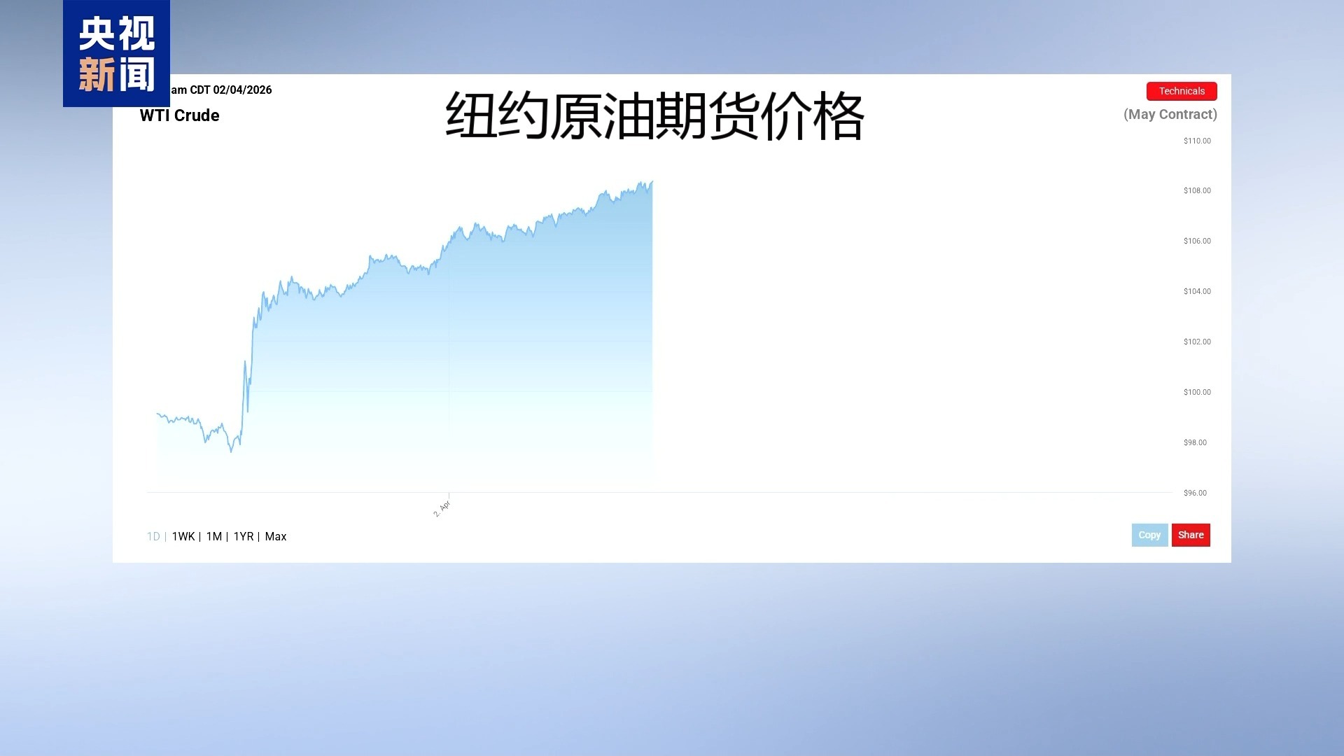 截至美东时间2日早上7点,也就是北京时间2日19点,纽约商品交易所5月交货的轻质原油期货价格最高升至每桶108.4美元,上涨8.26%;6月交货的伦敦布伦特原油期货价格最高升至每桶109美元,上涨7.75%。
