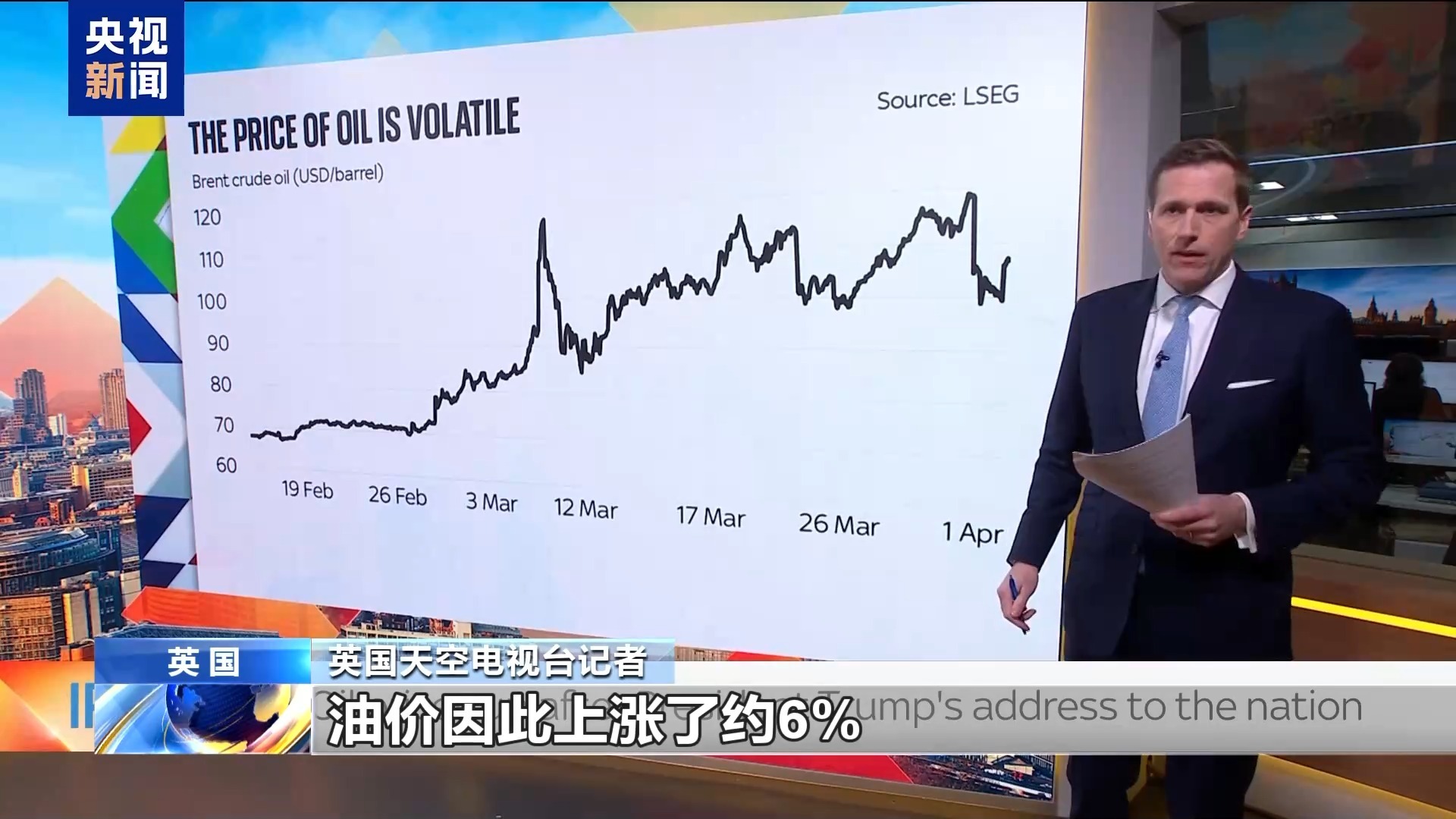英国天空电视台记者:我们来看看市场对这个讲话的反应。实际上,讲话中并未给出任何缓和路径,反而说明事态还将持续两到三周,油价因此上涨了约6%。目前布伦特原油价格报每桶107.5美元,这就是隔夜受讲话影响的油价涨幅,这是在48小时前油价大幅下跌之后,出现的反弹。当时市场普遍预期,这场讲话会释放明确的缓和信号。这张图表展示战争爆发前几天至今的油价,在此期间,油价从不到70美元大幅上涨至100美元以上。同时也能清晰地看到,市场对“战事可能结束”的预期反复出现,而油价的下跌也非常短暂。