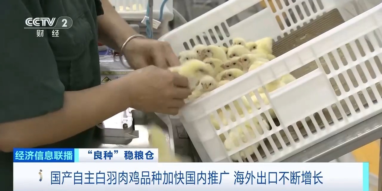 国产白羽肉鸡品种不仅受到国内养殖户的青睐,也受到国外客户的欢迎。在广东佛山一家白羽肉鸡育种扩繁基地,工人们正对出口的鸡苗进行筛选、疫苗注射、装箱。企业负责人说,这批种苗需要通过两次筛选,保留活力好、健康、毛色鲜亮的种苗出口海外,自2024年以来,来自南亚、非洲等国家的订单不断增加。