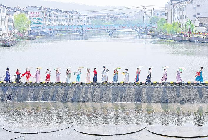 清晨,笛声悠扬,一条流动的“彩虹”蜿蜒经过新洲旧街花朝大桥。千余名汉服少女手持团扇,裙裾掠过青石路,宛如从历史画卷中款款走来。