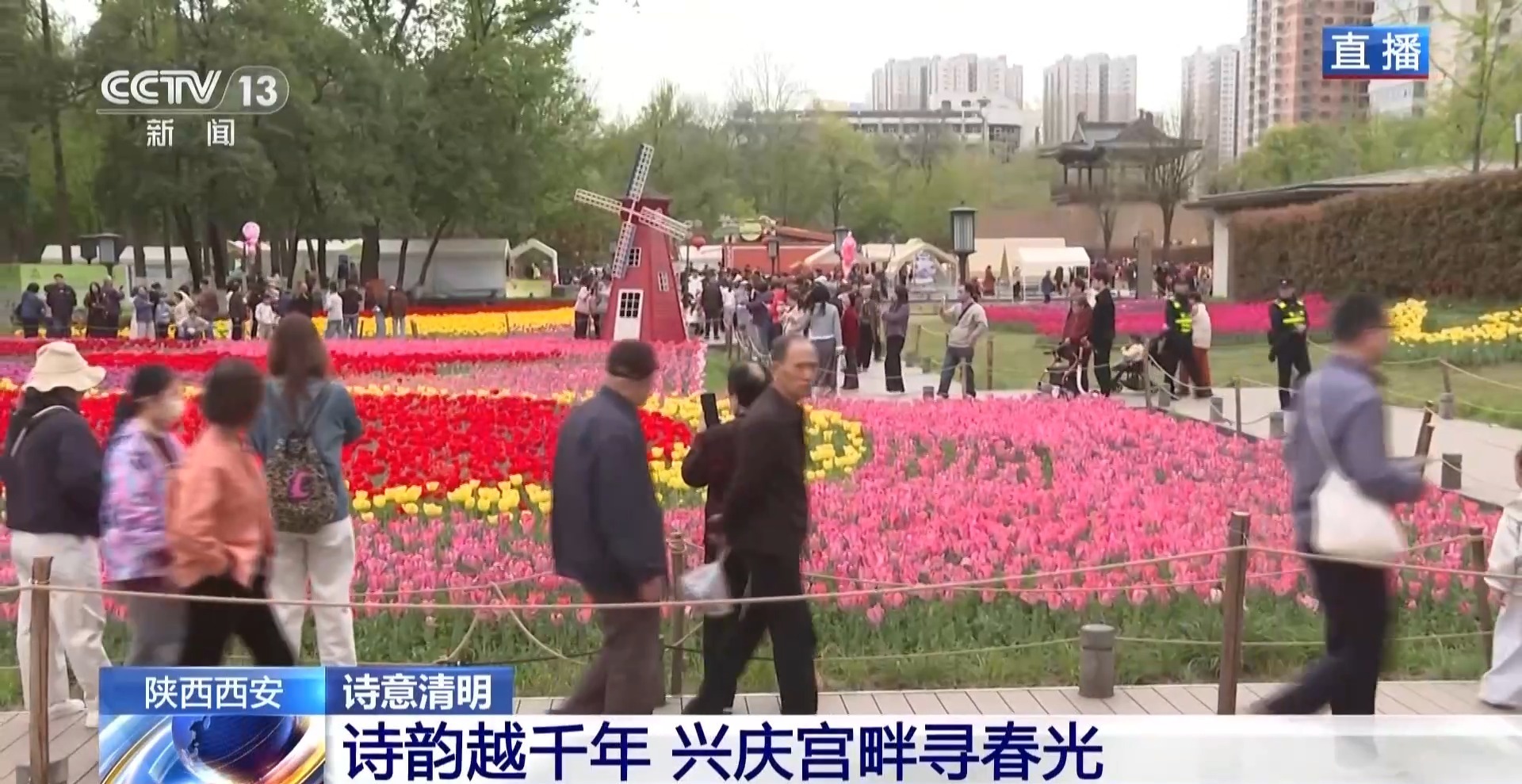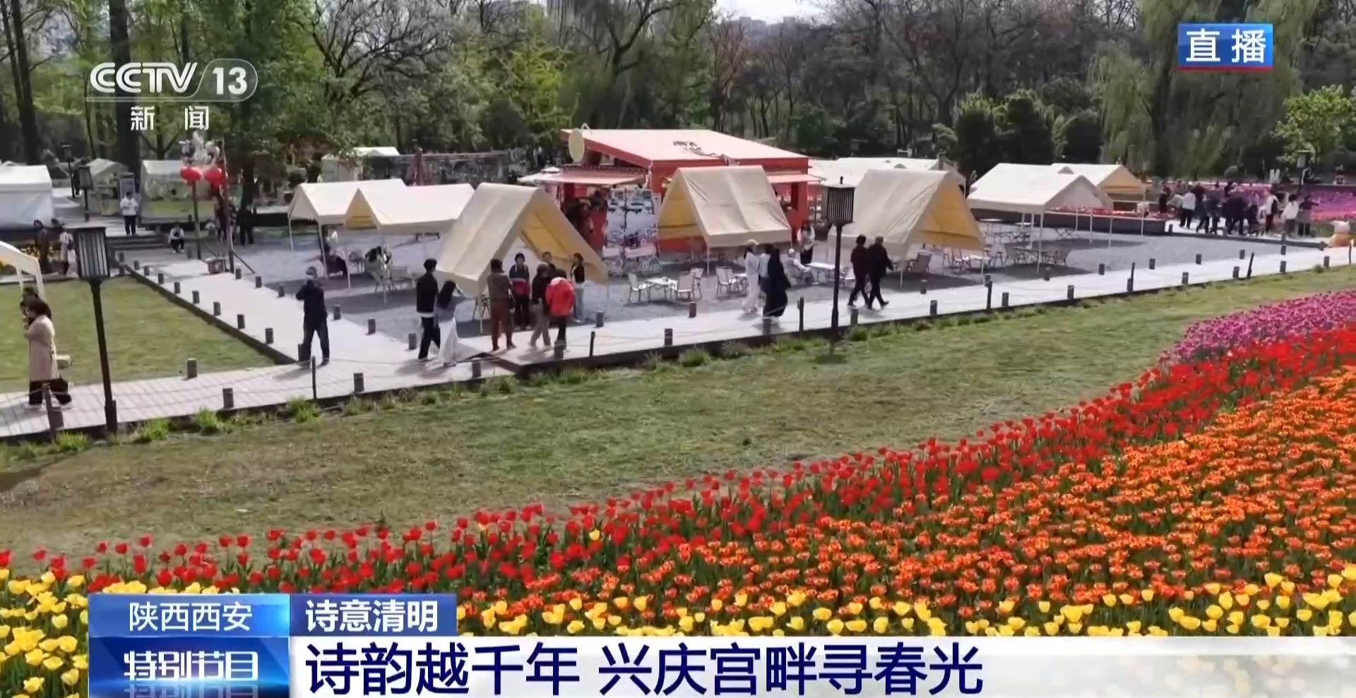 清明假期的第一天,陕西西安的兴庆宫公园已是花团锦簇、游人如织。今年清明节也恰逢兴庆宫春季花展,眼下正值郁金香的盛花期,其中在南门和西门区域的花海最为密集,共展出18个品种、21万余株郁金香,色彩绚丽、错落成景。