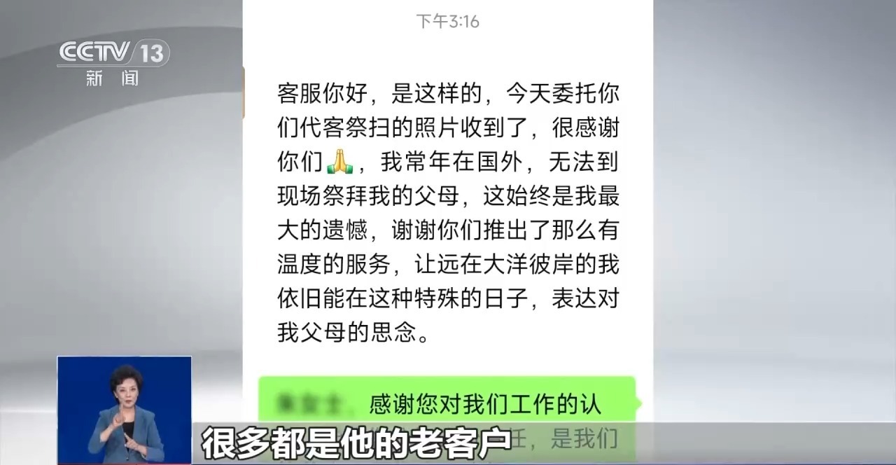 上海长桥山庄公墓工作人员 黄海荣:针对部分老年人不会操作智能手机的情况,我们仍支持电话下单。接到电话后,工作人员会人工添加对方为好友,将商品图片通过个人聊天窗口发送过去,对方再通过转账完成支付。一些老客户已经认识十多年了,有的单子一看到地址,我就知道对方叫什么名字,因为实在太熟悉了。