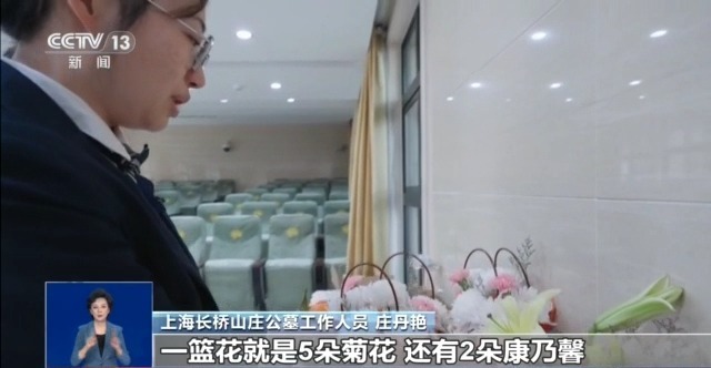 上海长桥山庄公墓工作人员 庄丹艳:一篮花就是5朵菊花,还有2朵康乃馨,还有几株情人草。时令水果我们一般采购的是橙子还有香蕉……
