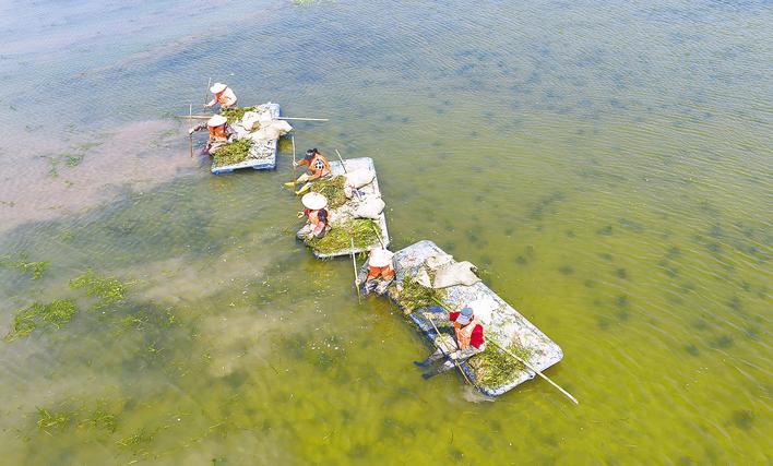 4月1日,工人们在船上为洪湖栽种沉水植物——苦草。