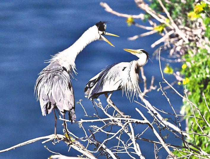 4月1日,十堰市郧阳区汉江岸畔的一处悬崖峭壁上,数以千计的苍鹭在飞舞嬉戏、筑巢孵卵、哺育幼鸟,构成一道独特的生态风景线。 (视界网 吴成林 摄)