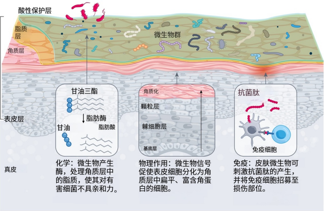 要知道的是,这些微生物是我们的“盟友”,它们参与皮肤的化学、结构和免疫防御,例如通过产生酶来处理脂质,使皮肤环境不利于有害细菌生存。不难看出,皮肤本身是一个自运行、有屏障防护功能的系统。
