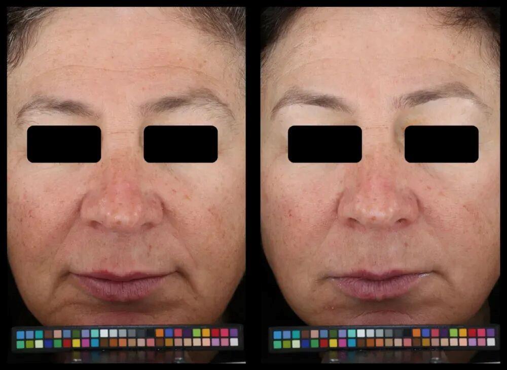 △一位49岁女性每日进阶护肤4周后的前后对比(左图:进阶护肤前,右图:进阶护肤后)