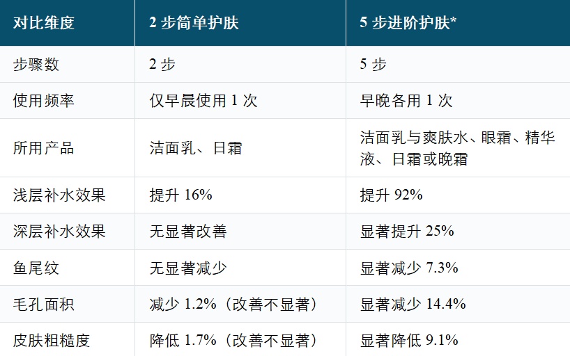 可以看出,护肤并非只有一种选择,只要使用了护肤品后没有出现干、红、痒、脱皮、敏感等异常表现,进阶护肤也未尝不可。后者虽然复杂,但对皮肤的改善效果,看起来会更好一些,这包括浅层补水效果、深层补水效果、鱼尾纹、毛孔和皮肤粗糙度等。