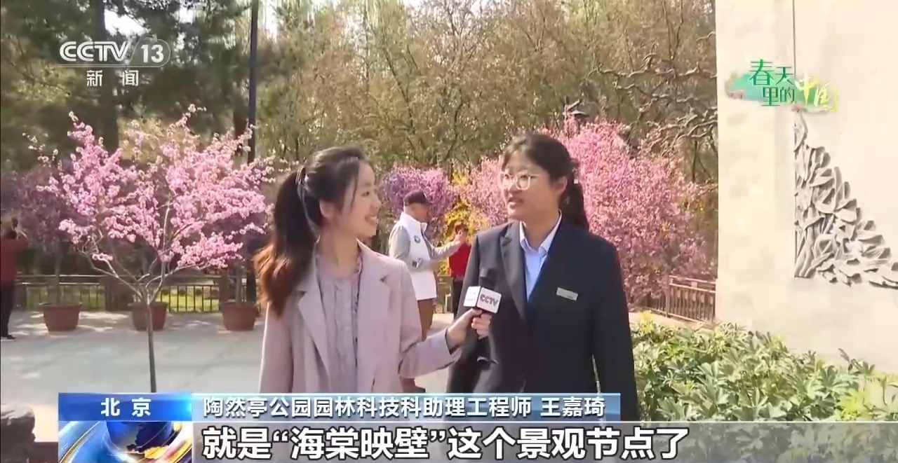 陶然亭公园园林科技科助理工程师 王嘉琦:今年打造了东门至北门,名为“陶然醉春风”的精品赏花路线,有四个节点,我们所在的是“海棠映壁”景观节点,可以看到古典传统“影壁”,映衬着现在春意盎然的春花景观,都是一片生机勃勃的绚烂场景。