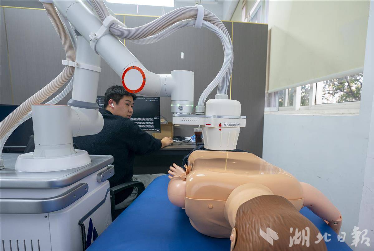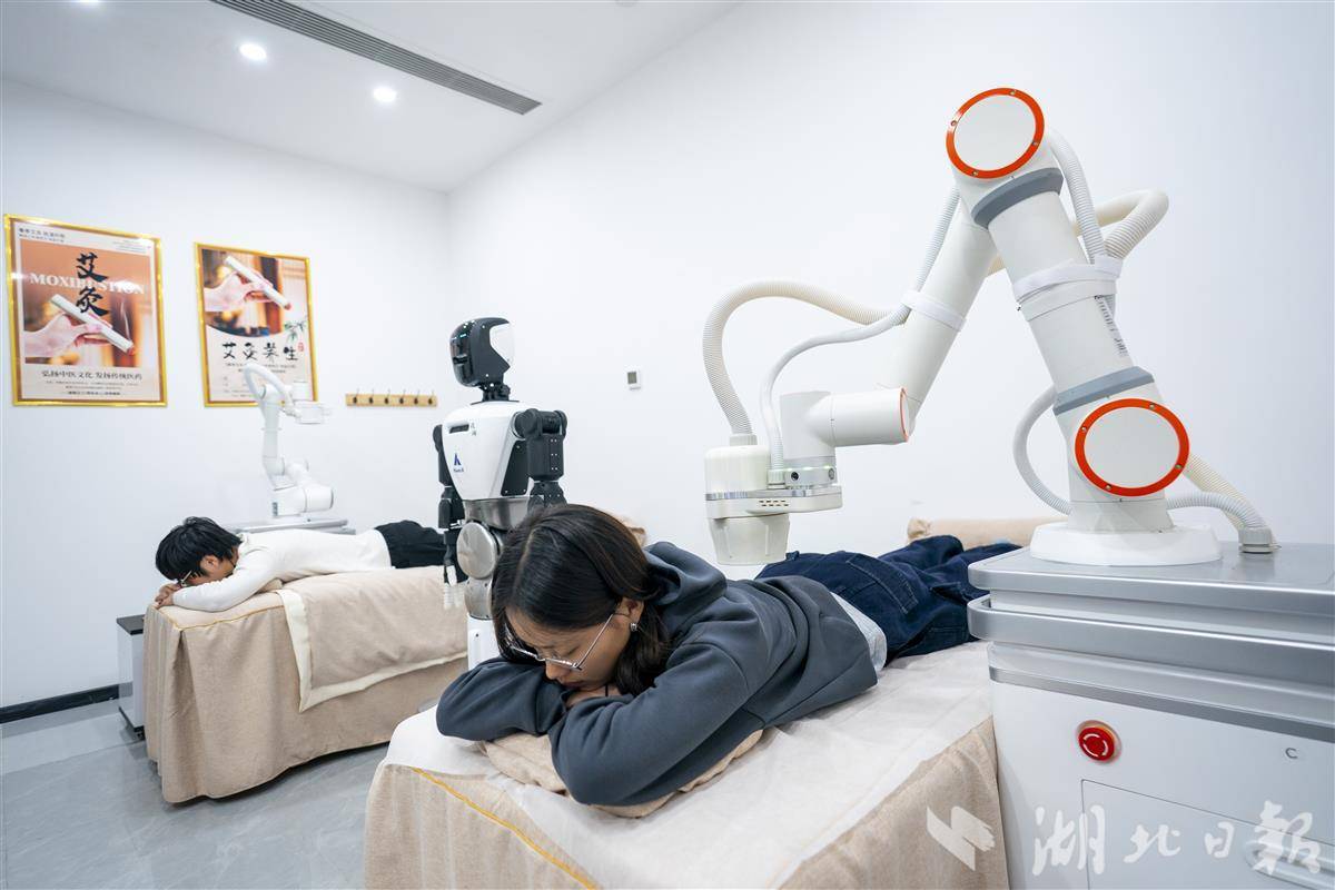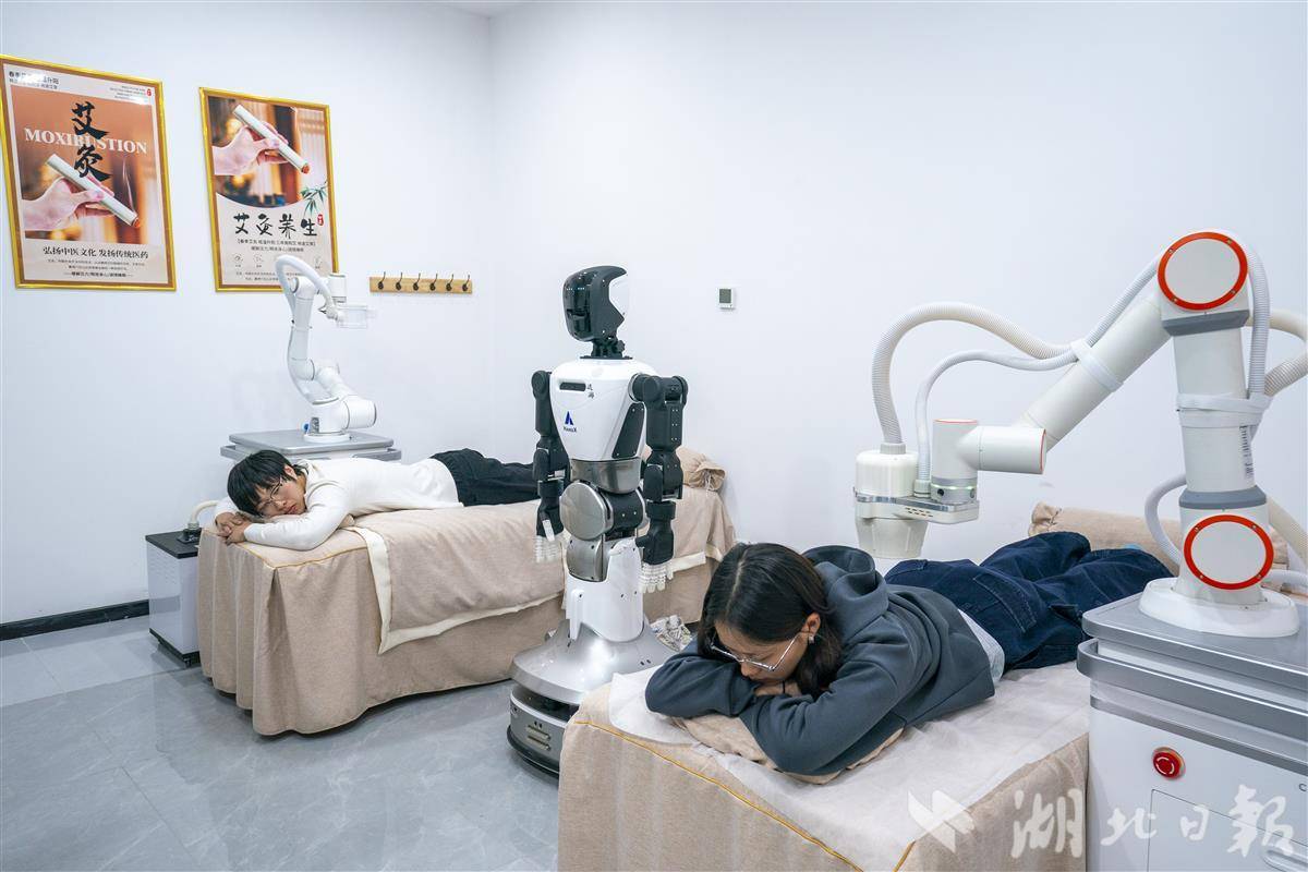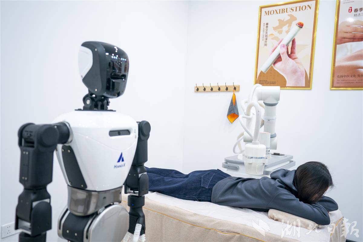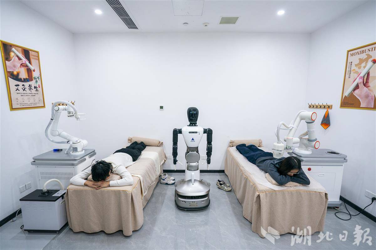 “你好,请问需要体验我们店的中医服务吗?”4月3日,武汉光谷中电智谷A栋2楼,一台人形机器人主动迎上前来,为顾客完成面诊、舌诊,给出健康建议,然后引导顾客进入艾灸室,体验机器人艾灸理疗。这是光谷人形机器人企业手智创新开设的艾灸机器人体验店,本月正式开业,3台艾灸机器人可同时上岗待客,单日最多可接待百人,市民花9.9元即可进店体验。目前,手智创新的艾灸机器人售价10余万元,除了在体验店营业,还在武汉大学中南医院、武汉大学人民医院、咸宁中医院、孝感中心医院等医疗机构上岗。公司生产基地一期生产线,今年第一季度已经获得1500台套的订单。(湖北日报全媒记者 魏铼 通讯员 张璨龙 摄)