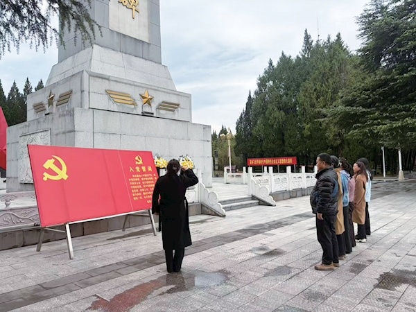 在革命烈士纪念碑前,全体党员面向鲜红党旗,举起右拳、庄严宣誓,铿锵誓言回荡在陵园上空。随后,全体党员向革命先烈默哀三分钟,表达深切哀思与崇高敬意,并依次敬献鲜花、整理花篮缎带,以庄重仪式缅怀英烈不朽功绩,寄托深切追思。
