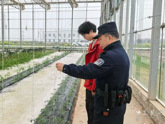 在湖北嘉鱼蔬菜科技园,农业数字化服务站监测屏实时更新着气象信息、病虫害防范等农事数据;空中植保无人机有序开展施肥喷药作业;田埂上,潘家湾派出所民辅警常态化开展动态巡逻,及时排查各类安全隐患、快速调解涉农矛盾纠纷,全力维护田间生产秩序。