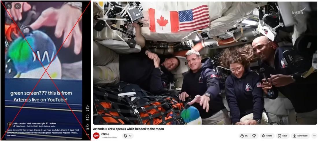 不过,反向检索可发现,这段画面的原始来源是美国有线电视新闻网(CNN)4月5日在视频平台YouTube上传的一段视频,内容取自NASA官方直播信号,标题为“阿耳忒弥斯二号乘组飞向月球途中发声”。对比原始数字视频可见,网传片段对应的大约同一时间点并没有出现所谓“字幕穿过玩偶”的情况。