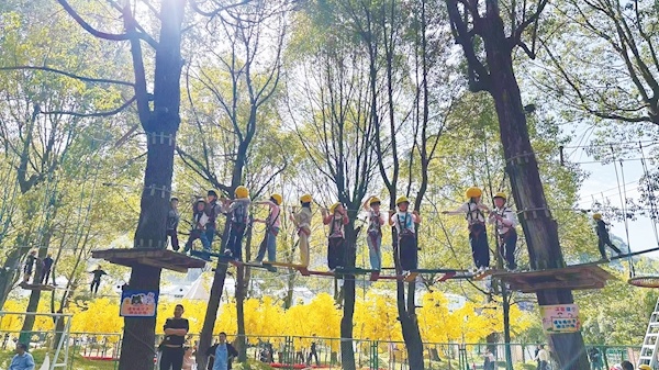 竹溪大石门仙暇小镇,孩子们在体验娱乐项目。