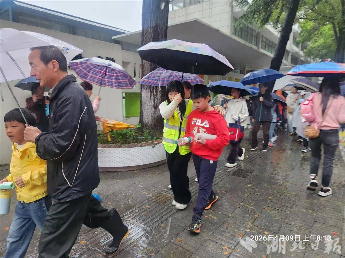 在湖北省武昌水果湖第一小学门口,“警校家护学岗”的家长志愿者们身披雨衣,撑着大伞,在风雨中坚守。他们引导车辆、牵起小手、挡住风雨,全力守护孩子们上学的“最后100米”。