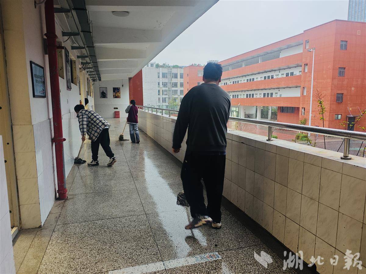 守护不仅仅在门口,更在校园的每一个角落。在中北路中学,雨落校园后,几位少年主动弯下腰,用拖把一点点清理地面的积水。