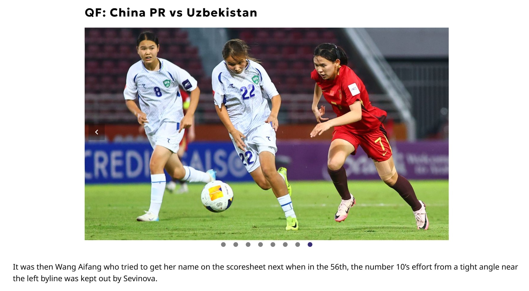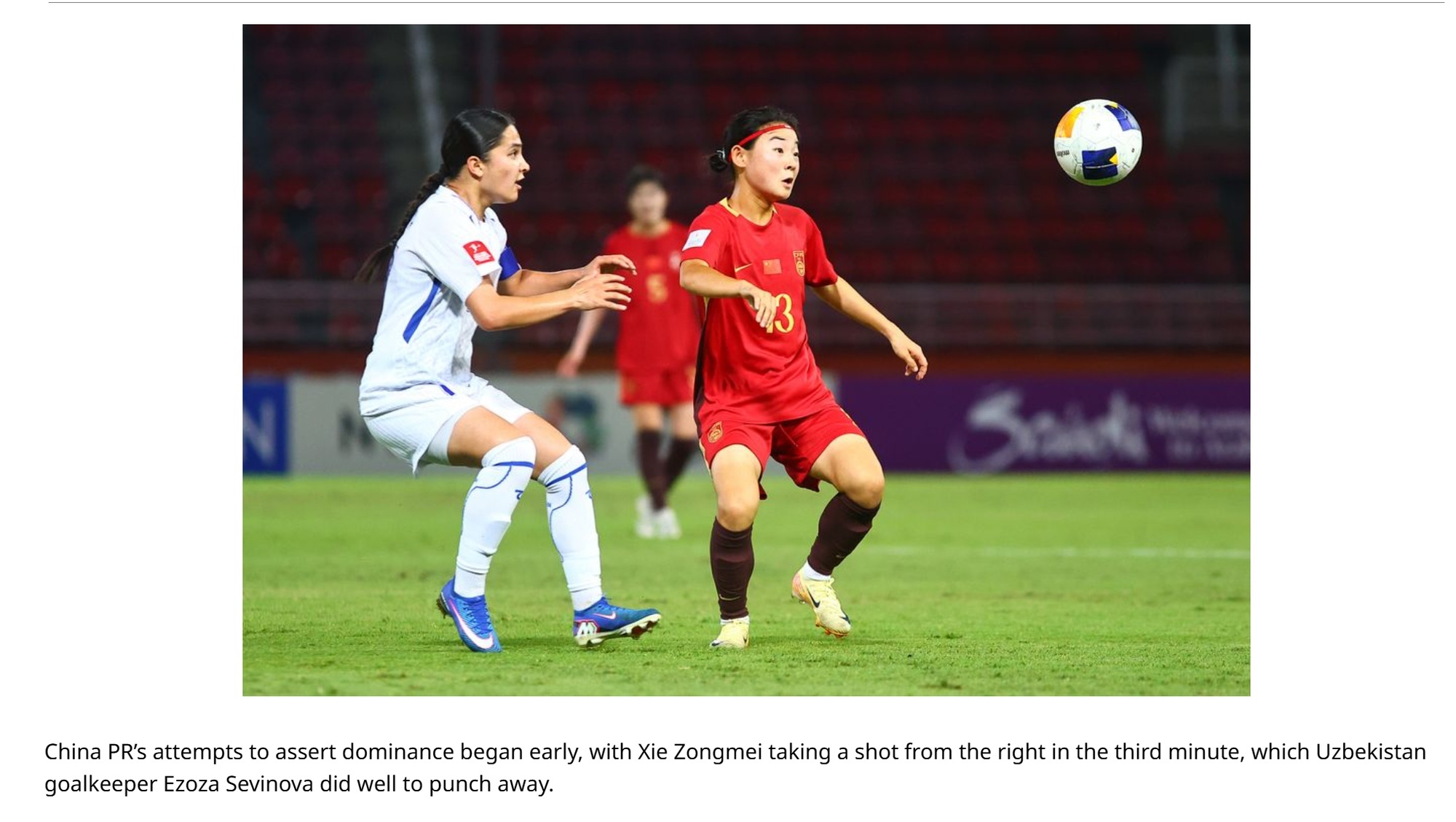 王爱芳、肖亚飞等球员确保了本队的阵型运转流畅。和小组赛一样,她们的全场控球率保持为对手的两倍。乌兹别克斯坦队的多次中路渗透都得到了有效遏制。