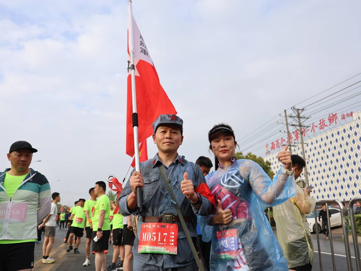 赛道上最亮眼的风景来自红安本地跑友祝红杰。他特意穿上红军军装,背上道具枪和大砍刀,手擎一面“中国工农红军”的旗帜,脚上的一双草鞋更是引人注目。一路上,他收获了无数的掌声。祝红杰说,这是他第一次扮演红军战士,用自己的方式向革命先辈致敬,未来还会更多地用这种独特的方式外出比赛,让更多人了解红安的红色历史。