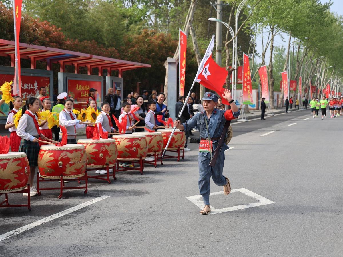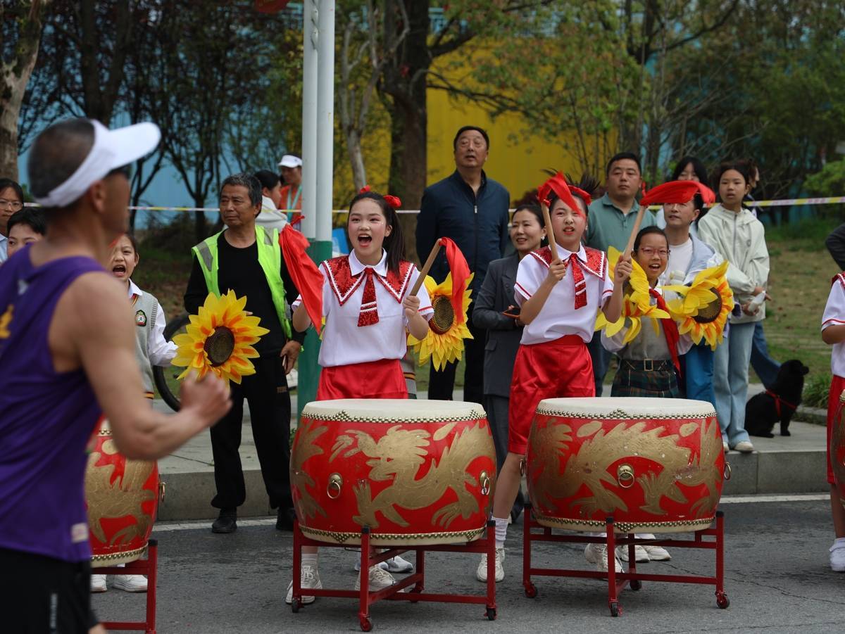 沿途13个演出点位,红安人民用最朴实的方式为跑者加油鼓劲。233米处,响起的冲锋号象征着“两百个将军同一个故乡”的荣光。在似马山体育公园,《英雄赞歌》的旋律激昂响起;城关镇政府门前,百人合唱《我和我的祖国》让不少跑者放慢脚步,情不自禁跟唱;南门河闸处,鼓舞《赛马》的鼓点催人奋进;1927广场上,少儿艺术团带来的《一条大河》舞姿优美,寓意红色精神代代相传。