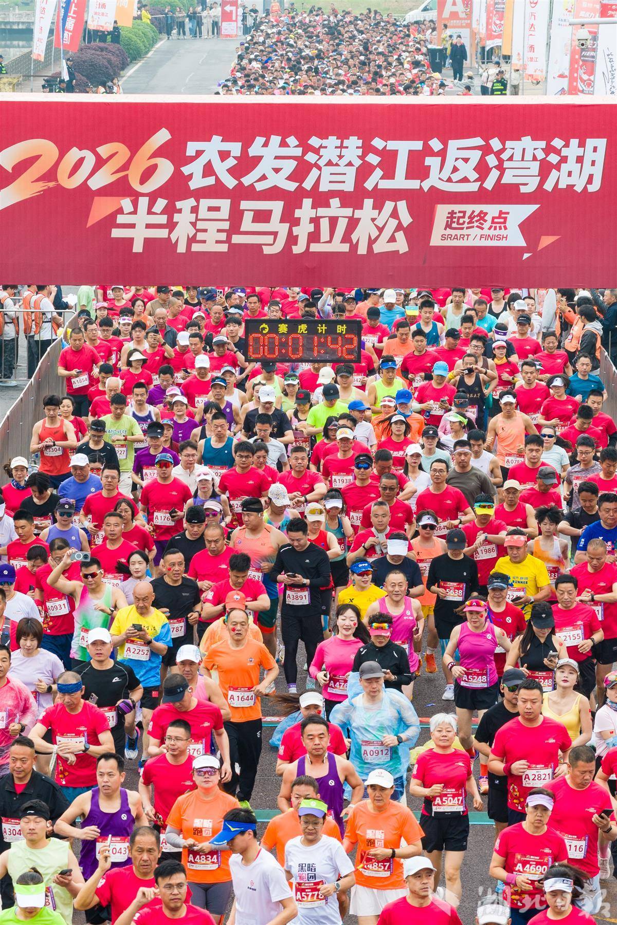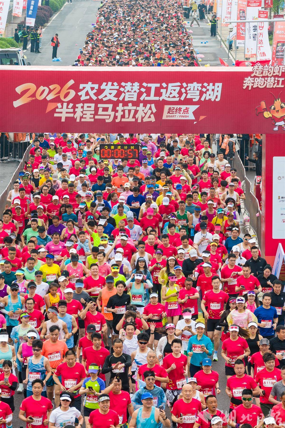 4月12日上午,2026潜江半程马拉松鸣枪开跑。6000名跑者奔赴赛场,穿行返湾湖国家湿地公园,漫步水杉廊道、相伴湖光鹭影,在古云梦泽画卷里迎风奔跑!