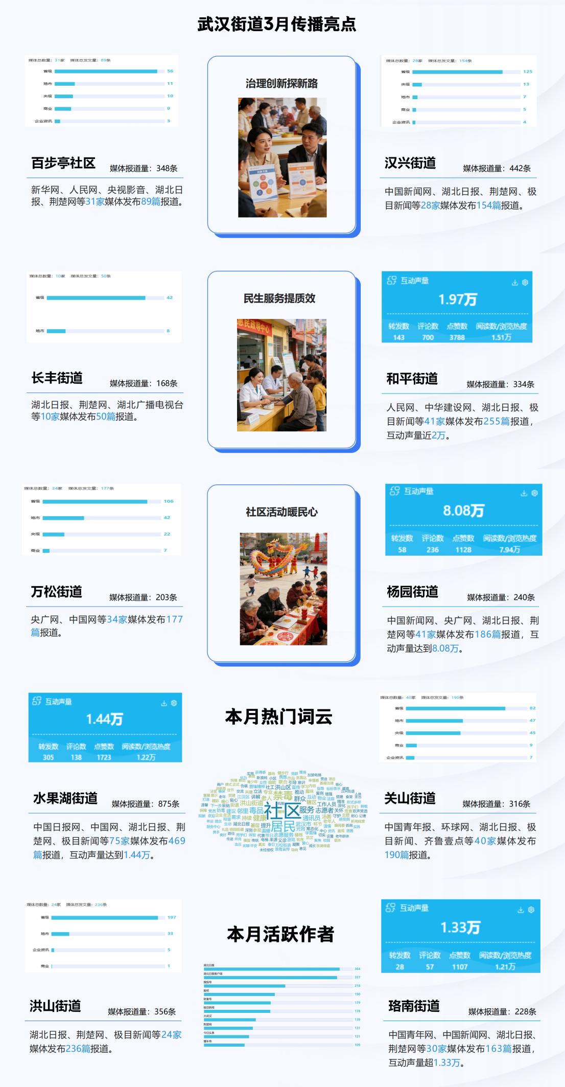 3月,武汉各街道聚焦基层治理创新、民生服务提质、社区活动等领域,深耕实践探索、打造特色举措,以精准化治理、精细化服务、多元化活动回应群众需求。央省地多级媒体聚焦各街道民生实效,通过深度解读、场景呈现、案例报道等方式,将基层治理新路径、民生服务新成果、社区活动新亮点转化为高传播度内容,形成治理有深度、服务有精度、活动有温度的传播新格局。