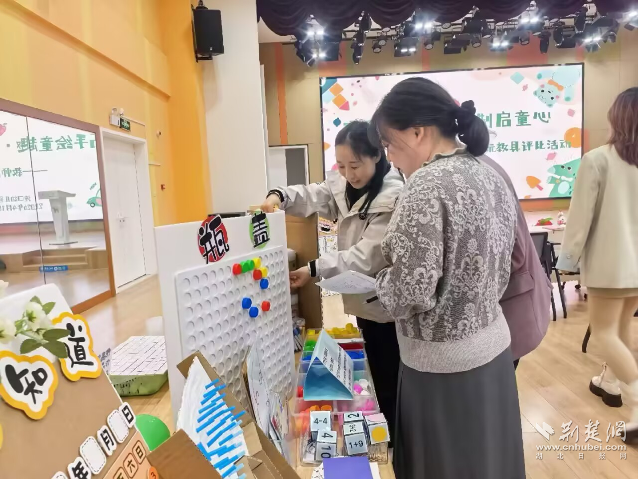 荆楚网(湖北日报网)讯(记者林杉 通讯员阮娟娟)4月10日,武汉经济技术开发区沌口幼儿园举办教师自制教玩具评比活动。教师们利用纸箱、瓶盖等废旧材料制作教玩具,并在现场逐一演示玩法。