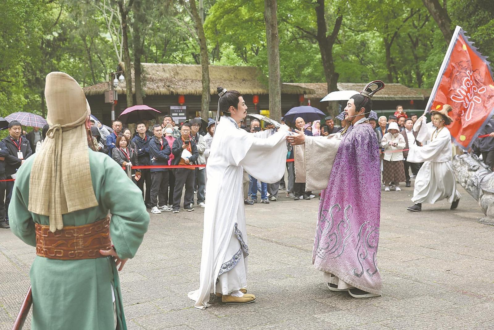 4月13日,2026年湖北省疗休养供需现场推介暨第二届劳模(职工)示范性疗休养活动在我市启动。图为参加活动人员在古隆中景区观看《三顾茅庐》实景演出。 记者杨东 摄