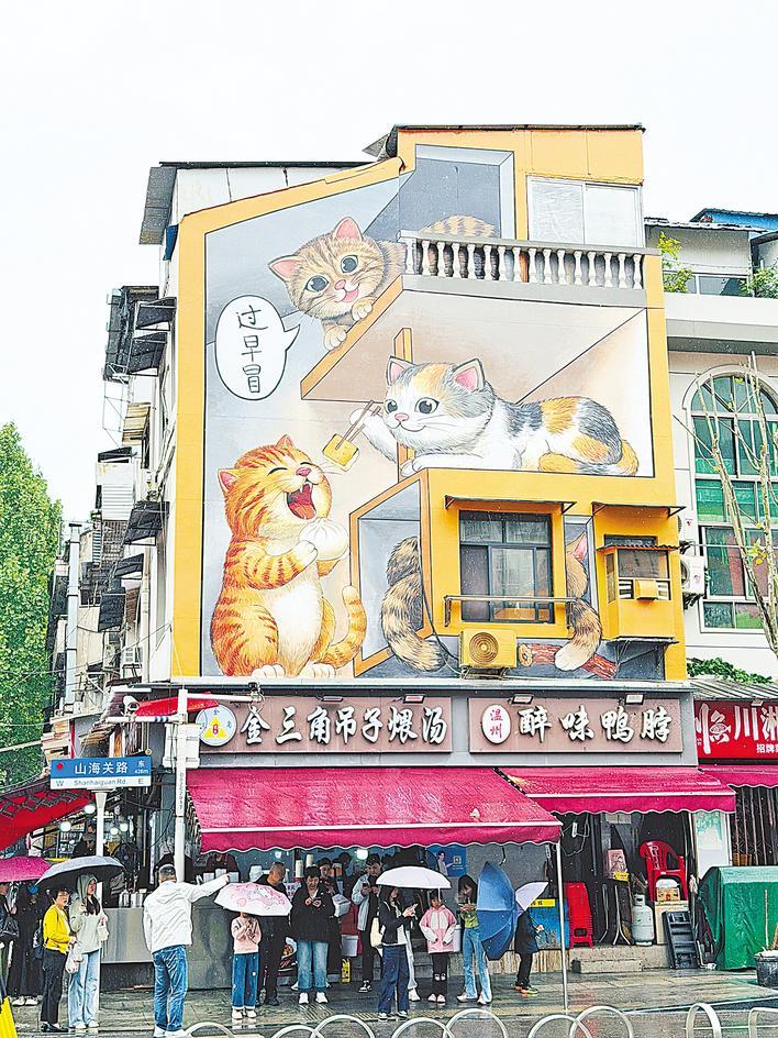 4月14日,武汉“过早”热门地山海关路惊喜变身!几只巨大可爱的“过早猫”悄然跃上老房墙壁,接近完工。“过早猫”与武汉话“过早冇”谐音,将地道市井烟火与萌趣涂鸦巧妙碰撞,市民街坊和游客纷纷驻足合影。当热干面的香气遇见墙上的喵星人,山海关路的清晨,正被创意与活力点亮。(湖北日报全媒记者 李溪 摄)