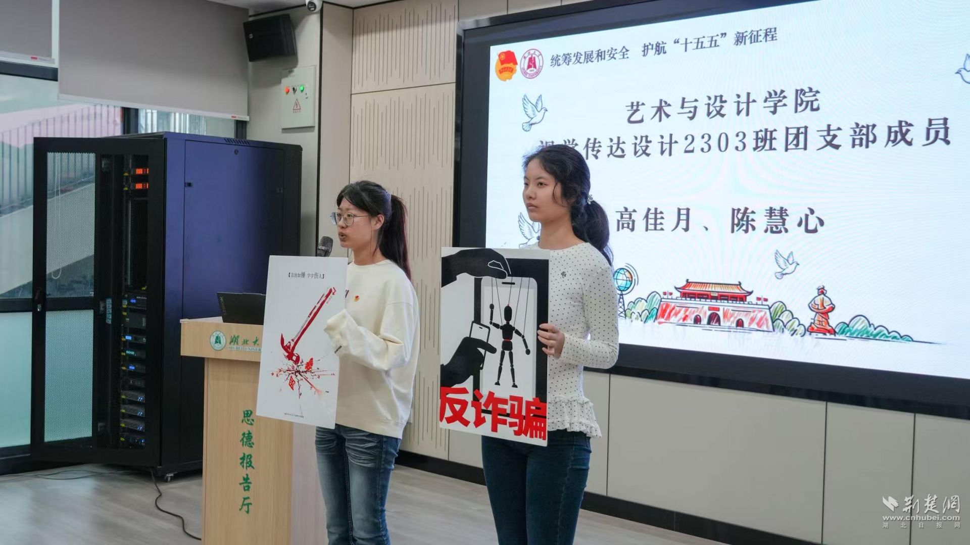 荆楚网(湖北日报网)讯(记者林杉 通讯员吴欣怡 孙依溪 高宇轩)4月14日,湖北大学以“统筹发展和安全 护航‘十五五’新征程”为主题,举办沉浸式国家安全教育示范思政课暨示范主题团日。该校党委副书记侯勇和艺术与设计学院视觉传达设计2303班团支部等聚焦国家安全,以艺术作品展、宣讲互动、情景演绎、集体宣誓等形式,共上一堂既生动、又深刻的国家安全教育思政课。
