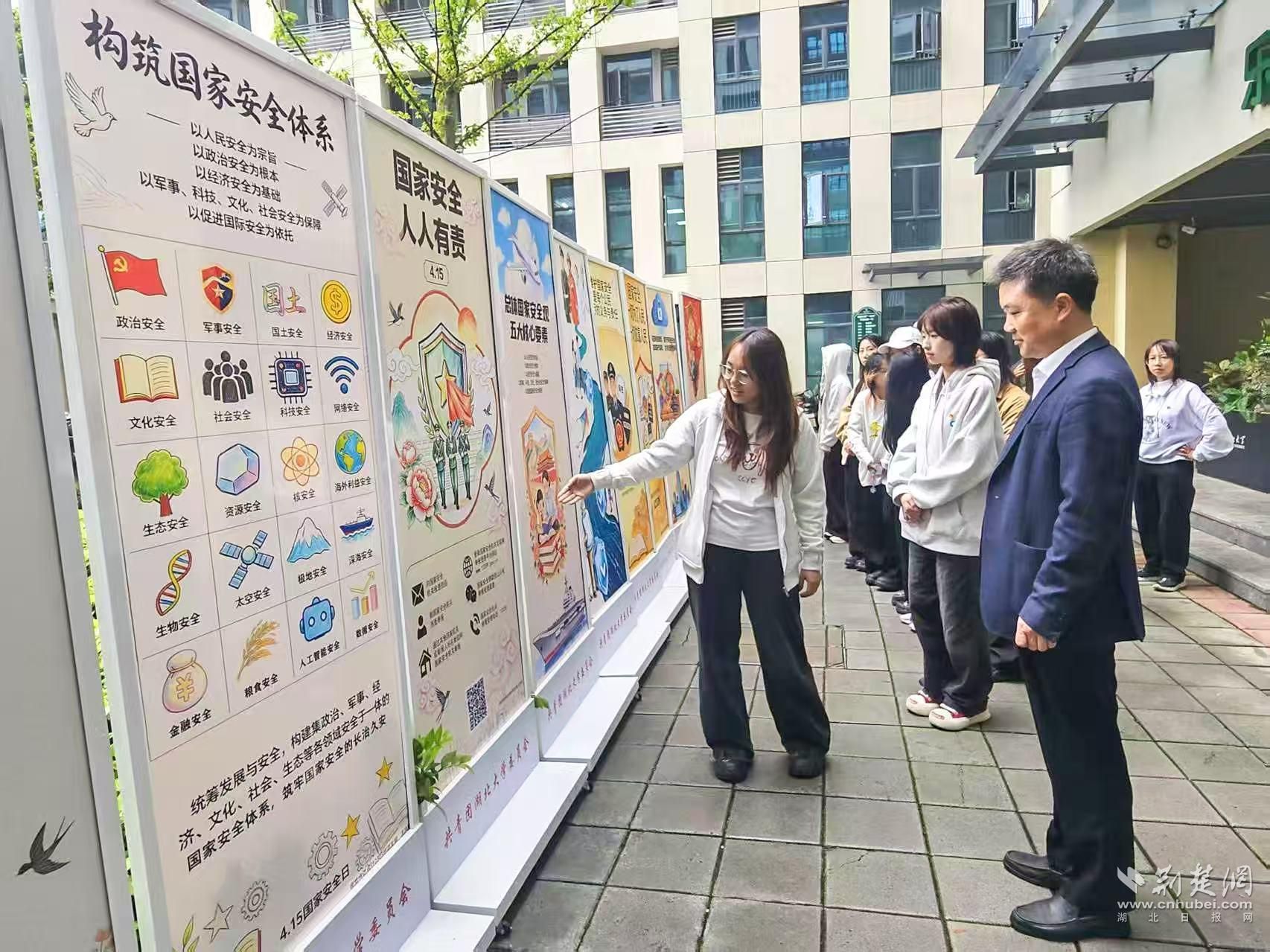 活动设置“国家安全知识问答”互动环节,师生在知识竞答中巩固安全知识。活动最后,全体成员庄严宣誓,以铿锵誓言许下维护国家安全的青春承诺,凝聚起“国家安全、人人有责”的青春共识。会场外同步展出由湖北大学艺术与设计学院学生原创的国家安全教育主题展板,呼吁青年群体守护清朗网络空间、筑牢国家网络安全防线。