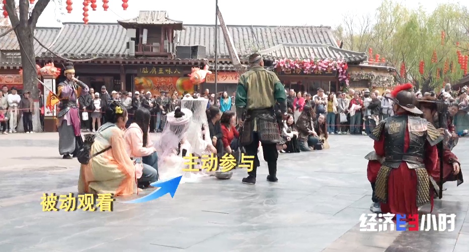 在开封,沉浸式体验成为文旅关键词。以前景区的演出游客在台下看,演员在台上演。为了打破这种“你演我看”的传统模式,他们正尝试拆掉台上台下那堵“墙”。几位演员走进景区,和游客面对面排起了新戏。