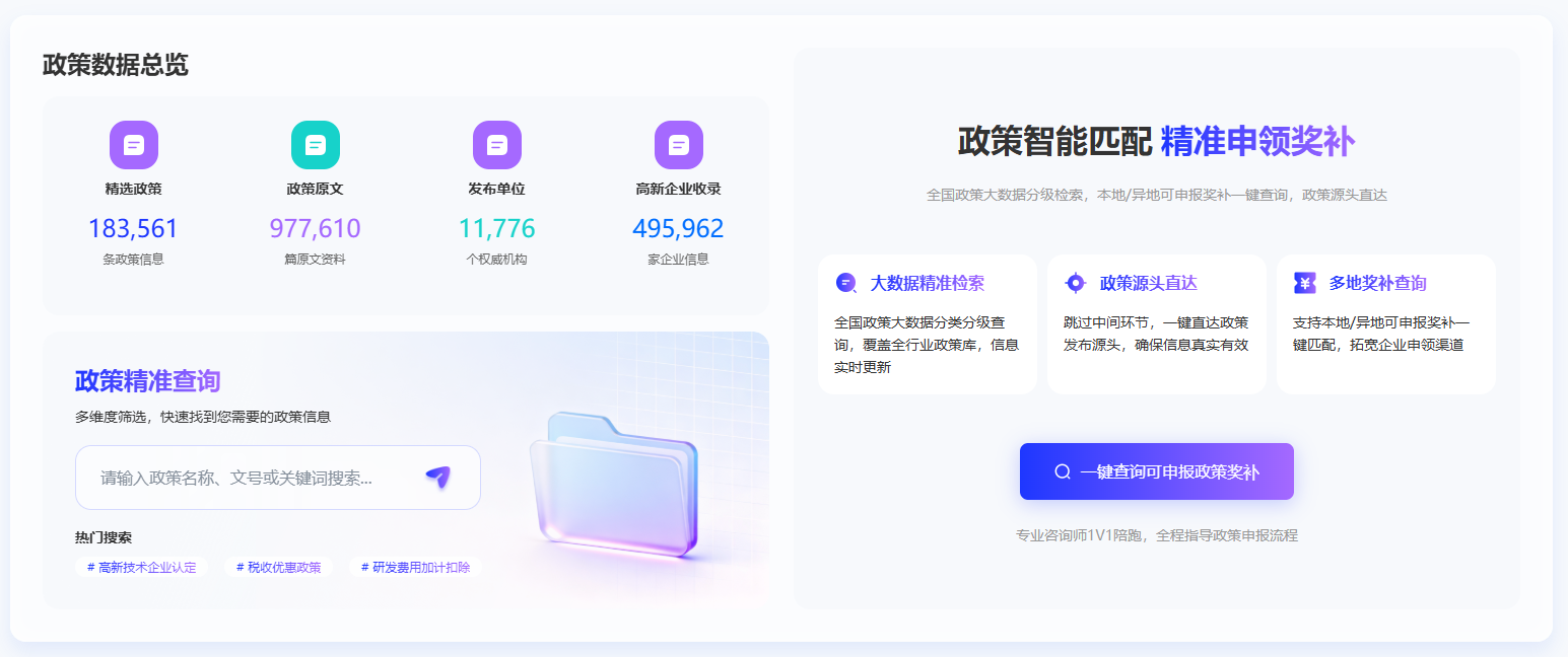 针对企业“政策获取难、解读慢、申报繁”的普遍难题,海创汇新官网以超大规模政策数据库为支撑,为企业与政府提供精准化、智能化的政策服务解决方案。该数据库汇聚超过18万条精选政策、97万余篇原文资料,链接近1.1万个权威发布机构,并收录49万余家高新企业信息。