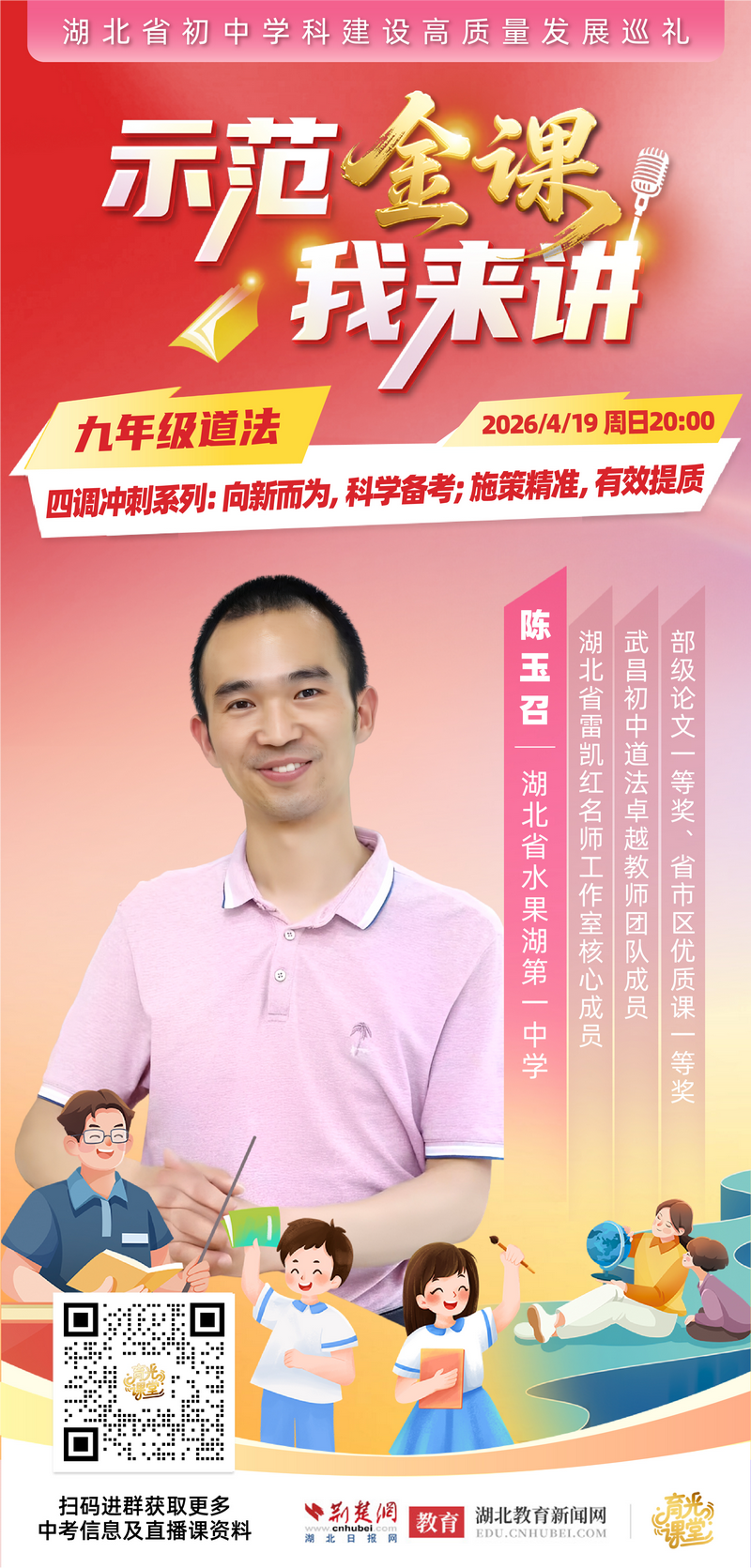 荆楚网(湖北日报网)讯(记者齐一璇)面对中考道法主观题的高分挑战,如何科学审题、精准表达、高效突破?4月19日晚8:00,湖北省水果湖第一中学道法教研组长陈玉召老师,将携其首创的“三审四角度”解题模型,在“示范金课我来讲——湖北省初中学科建设高质量发展巡礼”活动中,为你拨开迷雾,直击核心。