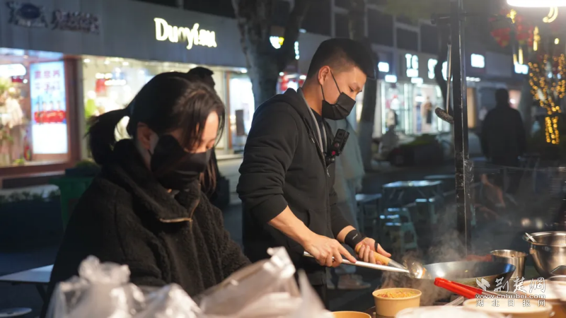 谁能想到,这位在摊位前熟练颠勺、浑身透着朝气的小伙子,此前还在电商行业的“内卷”里挣扎。“电商太卷了,没日没夜地守着屏幕,拼流量、拼价格,最后只剩下疲惫,看不到头。”说起过往,龚巨民语气轻松却藏着不易,一次偶然的机会,孝感的朋友向他推荐了鄂州南浦路:“来这里摆摊吧,人多、规范,流程简单,特别适合年轻人创业。”