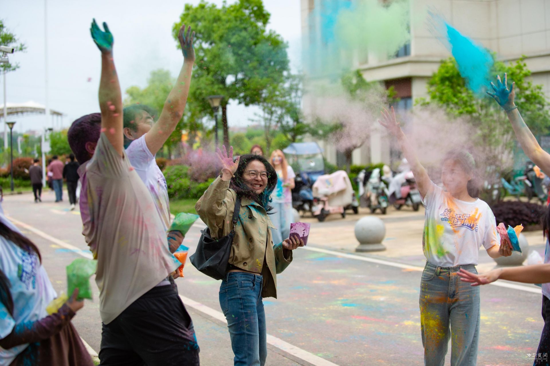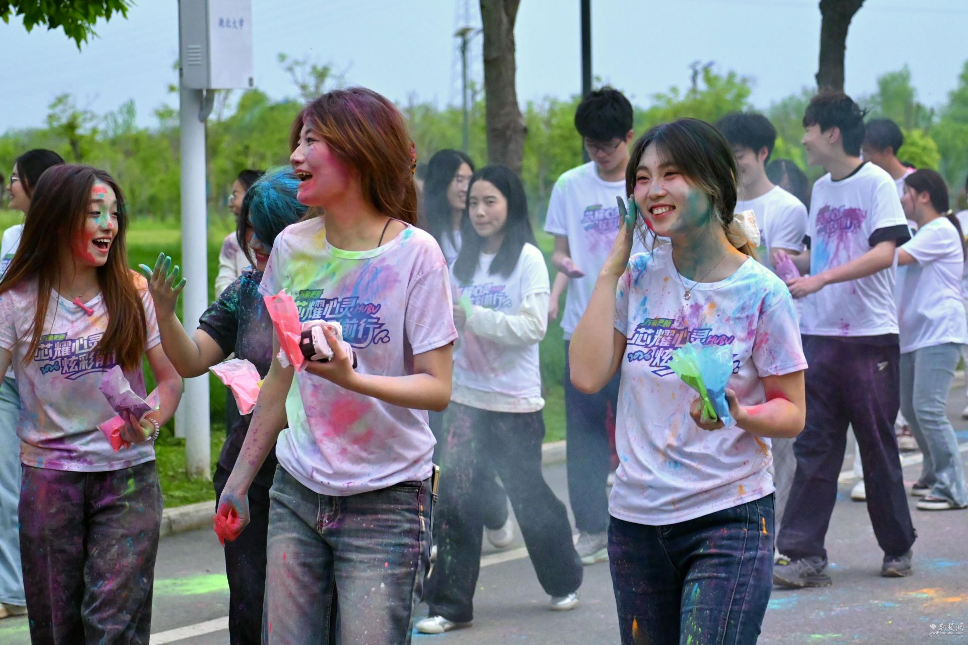 随着起跑枪响,学生们迎着春风活力开跑,沿途的五个打卡点化作制造尖叫与欢笑的“快乐工厂”。在“色彩寻人”打卡点,大家迅速破冰,寻找身着双色衣服的伙伴,三五成群挤在镜头前定格灿烂合照。全场最沸腾的瞬间,莫过于所有人不约而同将彩色淀粉奋力抛向天空,橘红、亮黄、湖蓝交织碰撞,划出一道道彩虹弧线。