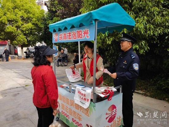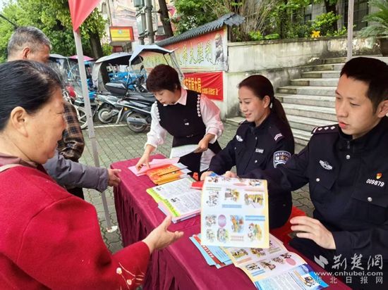 在鄂城区古楼街道北门社区,鄂城区分局古楼派出所民警联合社区网格员带着国家安全知识宣传册、海报,走进居民家中。“阿姨,这是国家安全知识宣传册,上面有很多实用的知识,您可以看看。”民警一边敲门,一边热情地向居民讲解。
