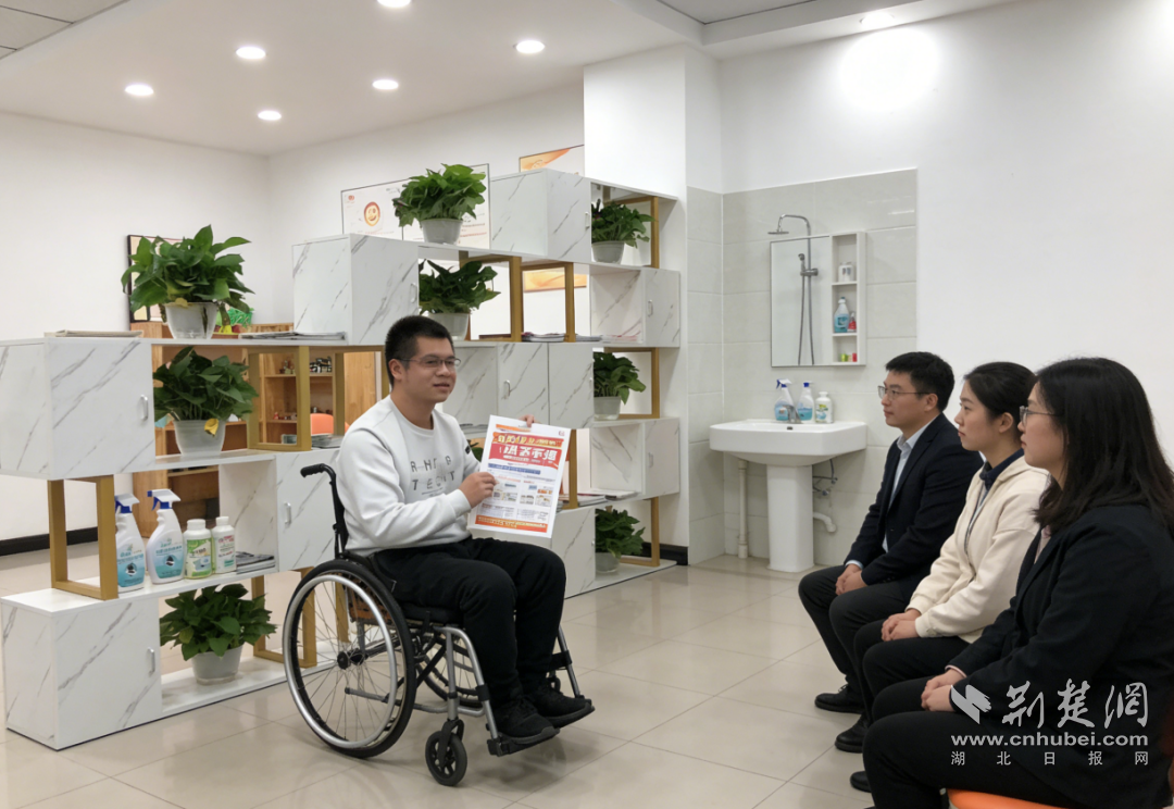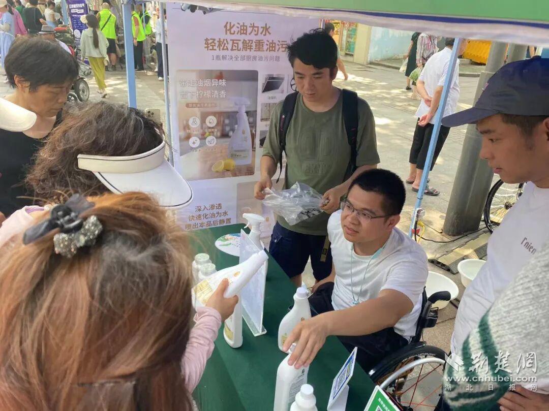 他做过包装工,也摆过地摊。对于肢体残疾的他来说,独立运输货物、摆摊上货、收摊打包,每一个动作都需要消耗常人几倍的体力。寒冬腊月,大风刮在脸上像刀割一样,他独自守在摊位前;酷暑盛夏,他背着沉重的宣传册,一家家物业公司去“磕”业务。多次尝试后,他联系上在咸宁开办日化工厂的叔叔,开始代销日化清洁产品。浴室清洁剂、厨房油污净、茶垢清洁剂……这些瓶瓶罐罐成了他的“武器”。